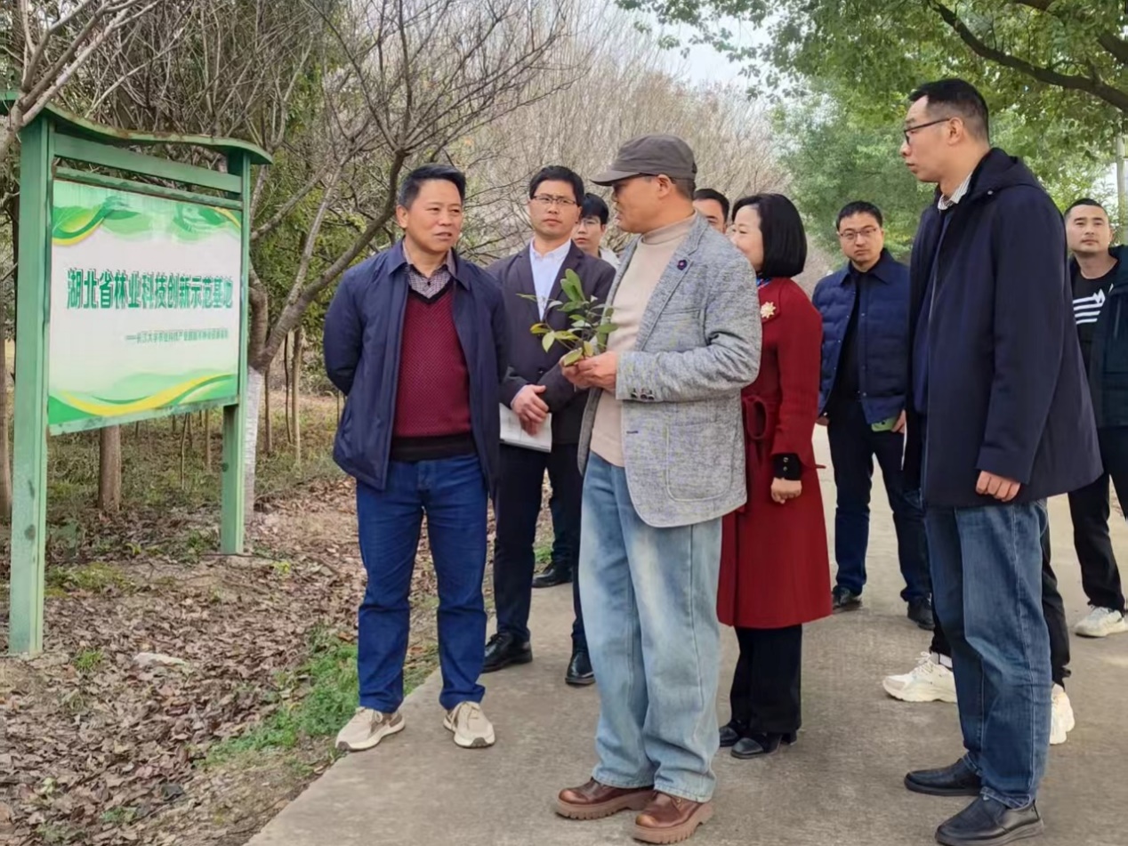 调研组实地考察了长江大学农业科技产业园内的楠木种质资源基地、植物保护野外科学观测研究站。我院费永俊教授现场介绍了楠木种质的收集范围、原生境保存技术、优良品种选育进展以及在生态修复和林业产业发展中的应用前景,展现了资源库建设的扎实基础与阶段性成效。