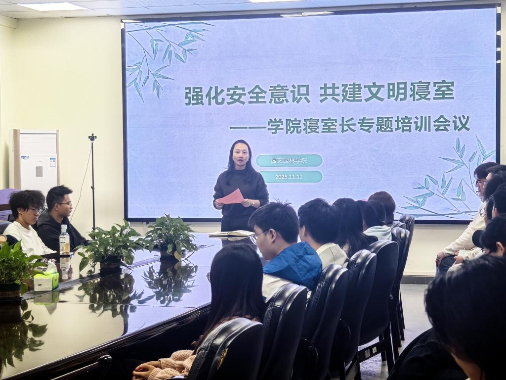 (通讯员:王秋艳)为强化学生安全意识,共建文明和谐寝室,园艺园林学院于2025年11月12日晚在农科大楼3002A会议室召开寝室长专题培训会。学院党委副书记黄仙、学工办主任张颖旭及全体寝室长参加会议。