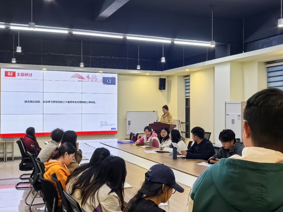 第一项,主持人周思涵带领学习习近平总书记重要讲话、重要批示精神,学习《关于〈中共中央关于制定国民经济和社会发展第十五个五年规划的建议〉的说明》及党的二十届四中全会精神。第二项,围绕学习贯彻党的二十届四中全会精神展开主题研讨,并谈心得体会。强调学生党员应该明确自己的历史使命和责任担当,胸怀“国之大者”,将个人理想融入祖国发展大局,锤炼本领,以过硬的专业技能应对未来不确定性挑战;第三项,学习《中国共产党章程》(第一章),每位党员依次朗读《中国共产党章程》(第一章)理论内容并相互讨论学习。第四项,学习《中国共产党纪律处分条例》、中央八项规定精神等内容,增强党性修养;第五项,全体党员起立重温入党誓词,增强身为党员的信念感和使命感。