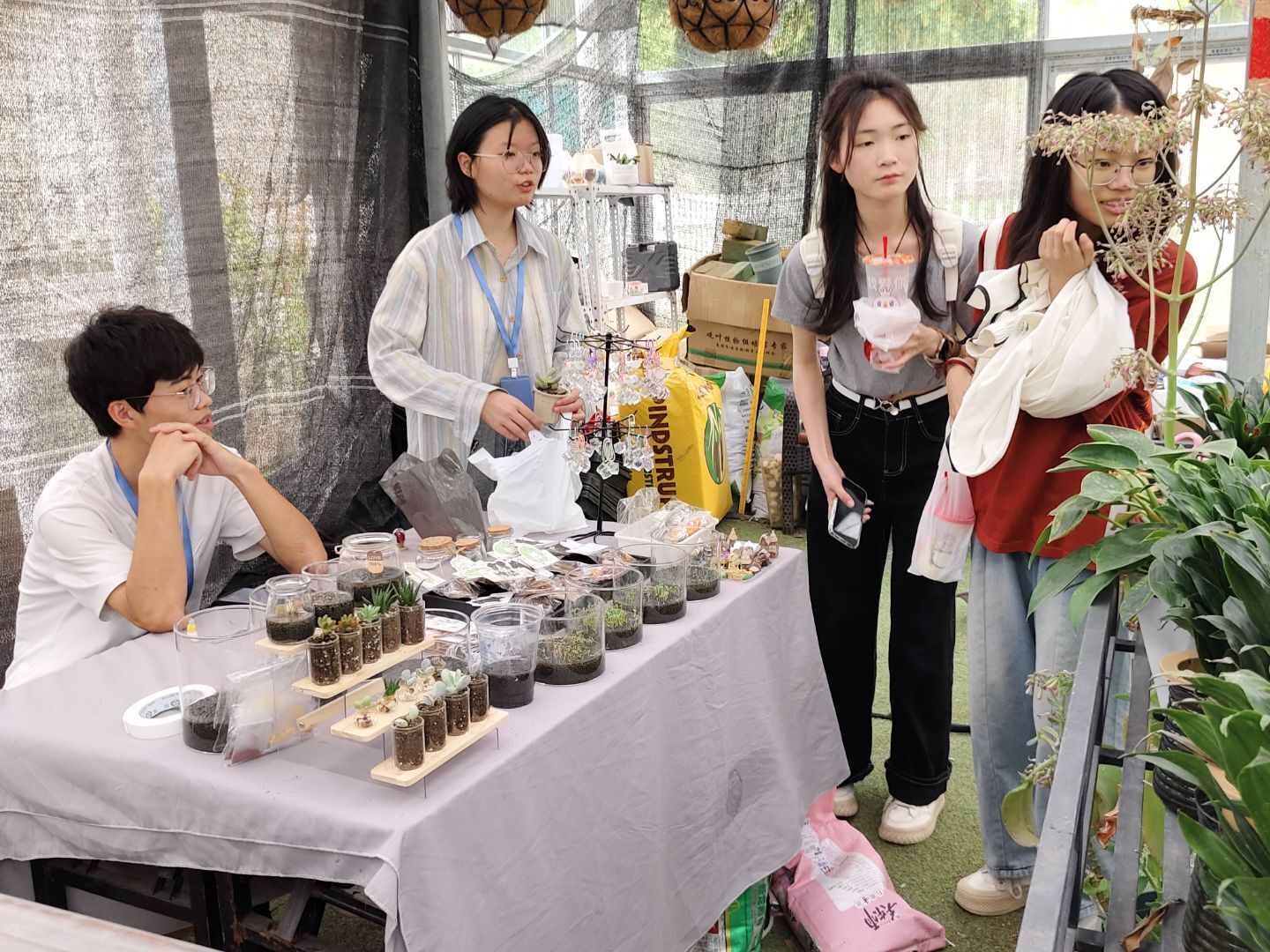 本次展览以“科普多肉文化,展现园艺特色”为核心,设置六大特色区域。多肉展览区与母本区集中展示近两百种形态各异的多肉植物,白鸟、青锁龙等特色品种搭配绿植装饰,让参观者直观感受多肉魅力;DIY制作区最受欢迎,师生可自由挑选多肉、盆器及装饰材料,在志愿者指导下完成拼搭、彩绘等创意作品,扭扭棒挂件、多肉书签等趣味衍生活动增添互动乐趣。