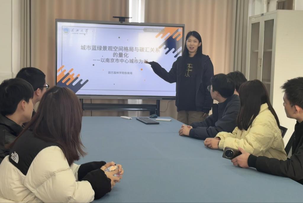学术汇报环节,来自两院的研究生代表依次登台分享研究成果,展现了扎实的科研功底与创新的学术视角。来自园艺园林学院研究生杨佩瑶汇报主题为《城市蓝绿景观空间格局与碳汇关系的量化——以南京市中心城市为例》,该研究以南京市中心城区为对象,围绕蓝绿景观空间格局与碳汇的关联展开探究。针对以往城市碳汇研究多孤立关注蓝、绿空间,且缺乏中心城区蓝绿协同固碳机制分析的不足,确立了探究蓝绿空间协同碳汇影响、识别关键格局指标、提出空间规划优化方法三大目标。明确了蓝绿景观格局对碳汇的显著影响及协同作用,为中心城区蓝绿空间的规划、管理和生态修复提供了科学技术支撑。